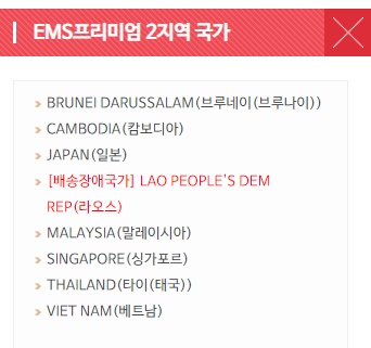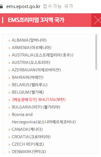 도착국가의 발송요금을 안내하며 접수가능정보를 표시하지 않습니다. 도착국가의 정확한 접수가능 정보는 우체국 및 1588-1300으로 문의해 주시기 바랍니다. EMS방문접수신청 시 EMS방문수수료가 �
