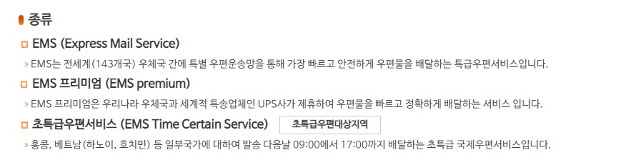EMS는 총 3가지가 있습니다. EMS(Express Mail Service), EMS 프리미엄, 초특급 우편서비스(EMS Time Certain Serveice)가 있습니다.