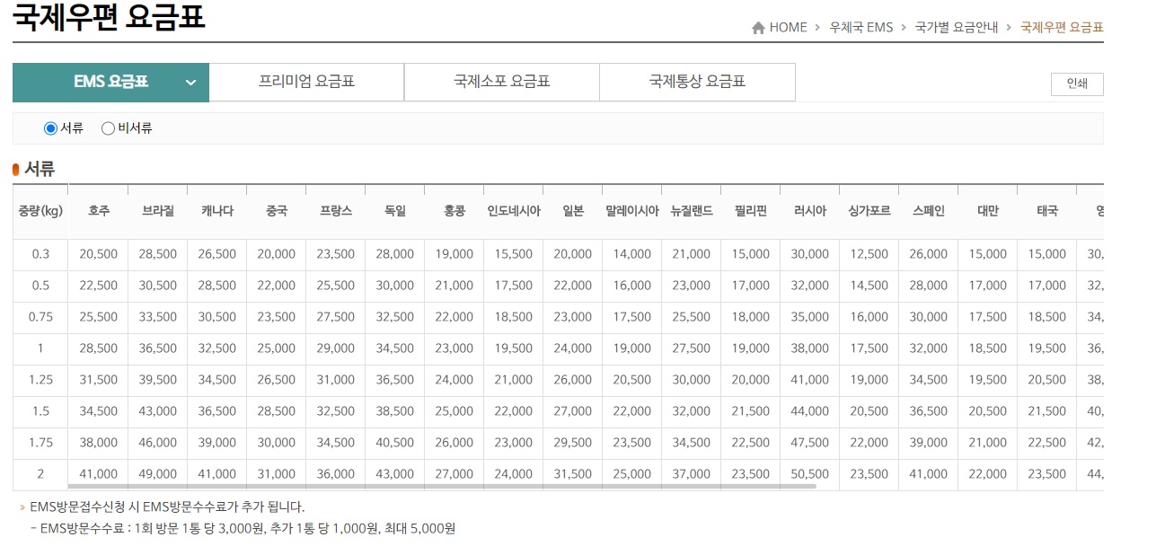 EMS는 전 세계 143개국 우체국과 연결되어 우편물을 배달하는 특급우편 서비스입니다. 중량과 거리 단위로 요금이 책정됩니다.
