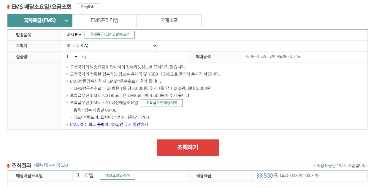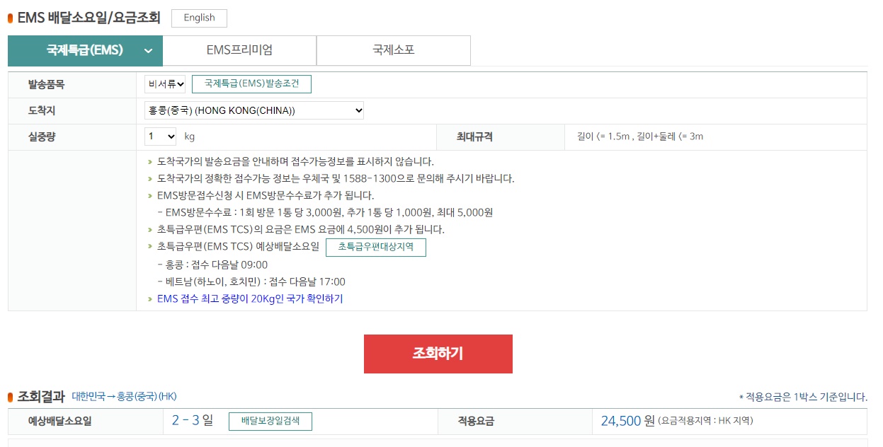 제가 위에 미국과 홍콩을 1kg을 기준으로 해봤을 때 금액은 미국 33500원 3~4일 배달일, 중국 24500원 2~4일 배달이 소요됩니다.