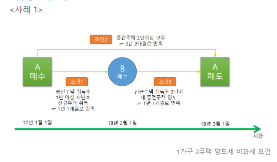사례 1의 경우 17년 1월 1일 종전주택을 매수하였고 19년 3월 1일 종전주택을 매도하였습니다. 이때 위에서 언급한 3가지 조건을 다 만족합니다. 그렇기에 비과세를 받을수 있었습니다.