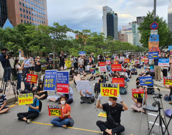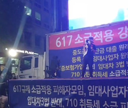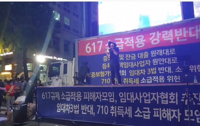 ‘6·17 규제 소급적용 피해자 구제를 위한 모임 온라인 카페 회원 등 정부 부동산 대책 반대 시민들이 18일 중구 예금보험공사 인근에서 집회를 하고 있다.